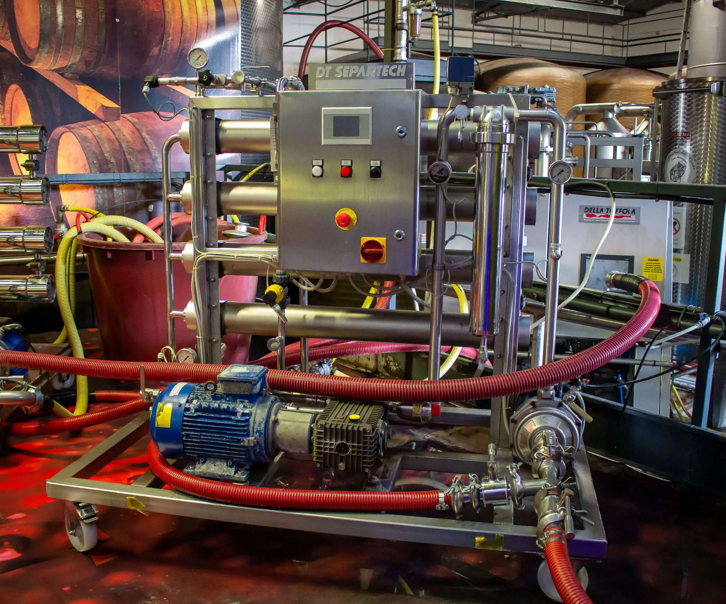 Gli impianti Microtechwine di DT Separtech sono progettati per la filtrazione di vini e mosti, garantendo un'elevata efficienza di recupero del prodotto trattato. Questi impianti utilizzano membrane filtranti che mantengono inalterati i parametri del prodotto iniziale, preservandone le proprietà originali. Questo tipo di tecnologia è molto utile per mantenere la qualità e le caratteristiche organolettiche del vino.